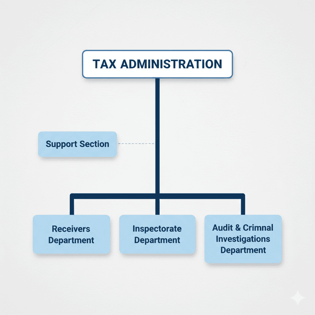 The Tax Administration consists of three departments and a section that supports these departments.