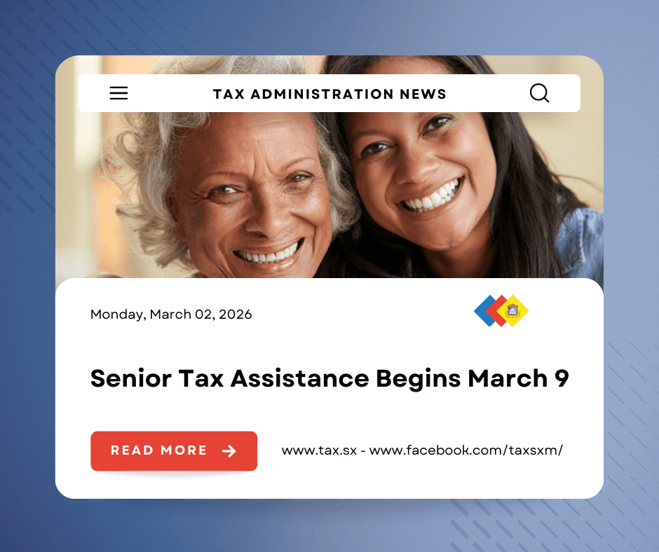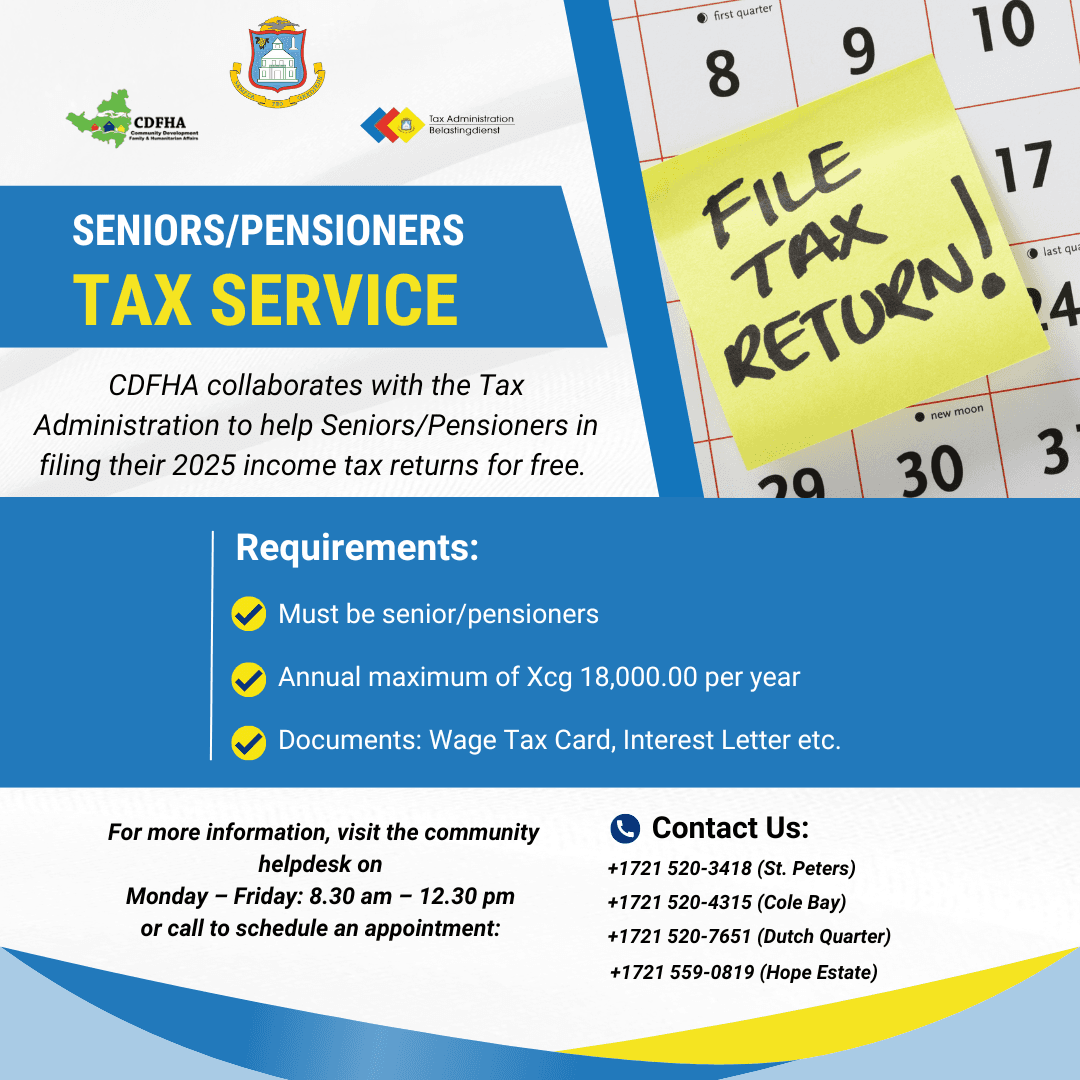 The Sint Maarten Tax Administration, in collaboration with Community Development, Family & Humanitarian Affairs (CDFHA), is pleased to announce the launch of the annual Senior Tax Assistance Program for the 2025 tax filing period, beginning March 9, 2026. The program offers seniors and pensioners free assistance with completing and submitting their Income Tax Forms and is open to those earning a maximum annual income of Cg. 18,000.